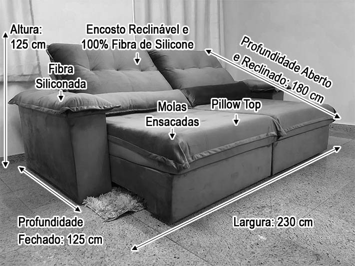 Sofá Retrátil Reclinável 2,30 m Cinza 502 Campo Grande